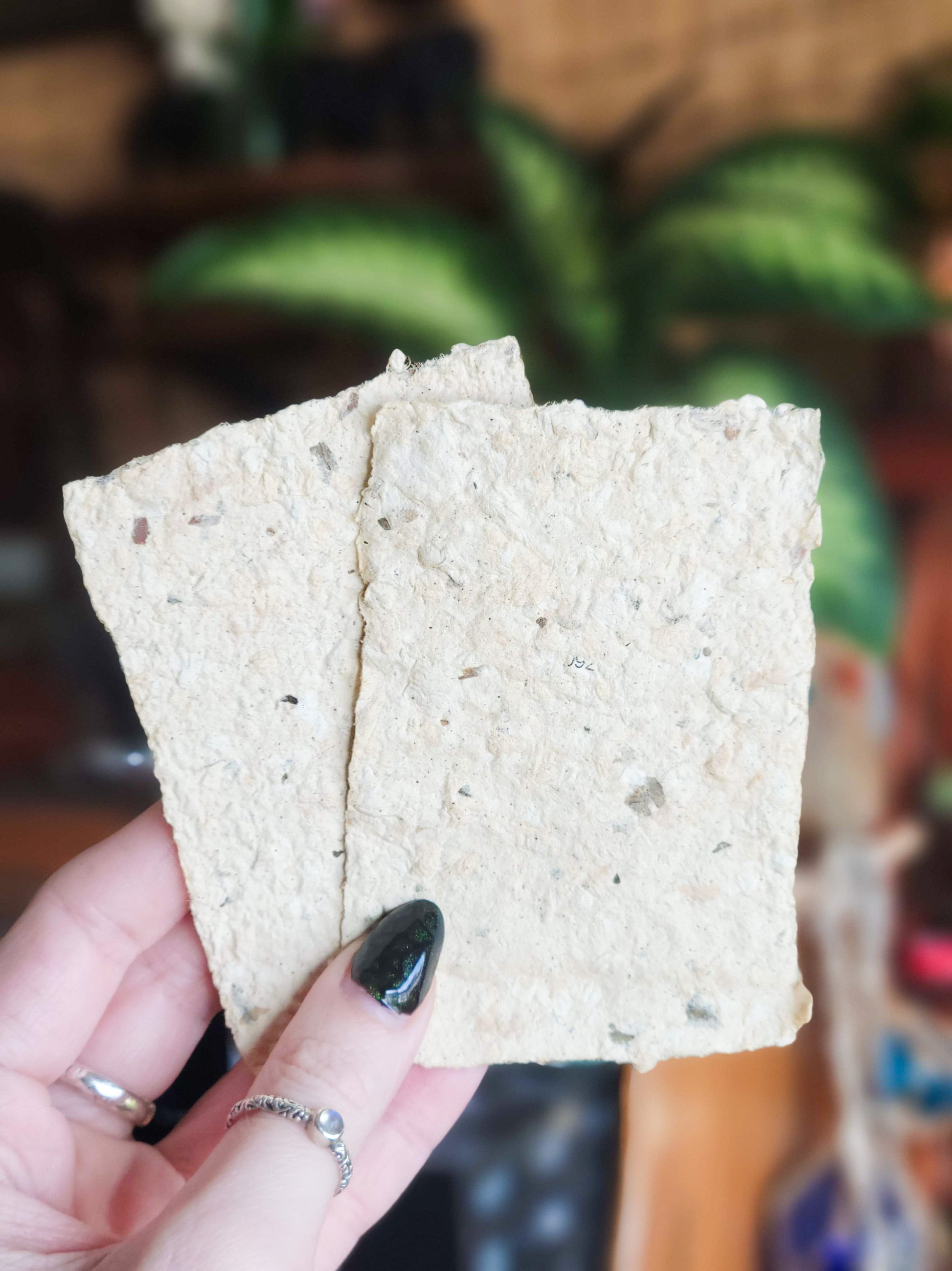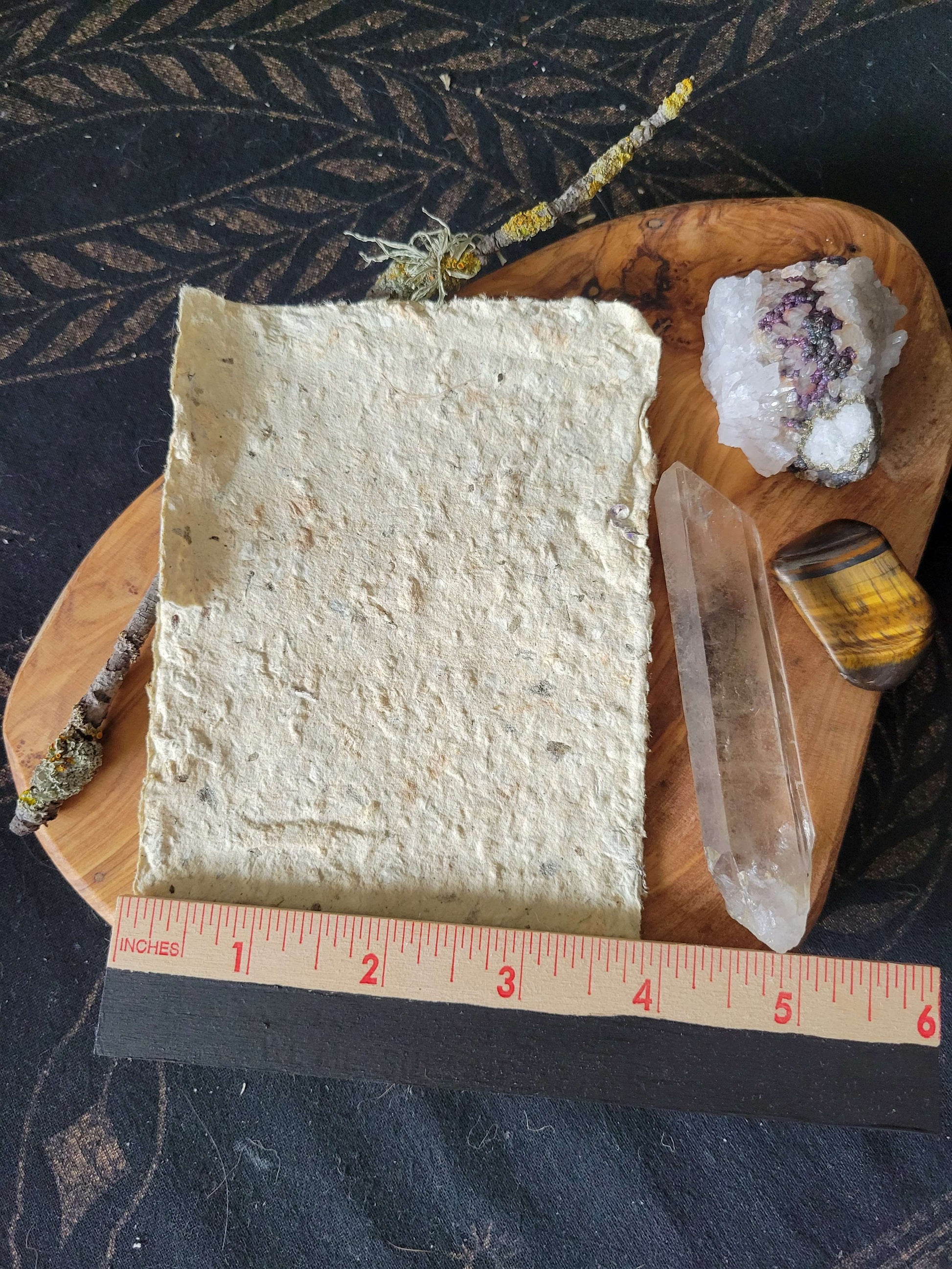 All papers are deckle-edge hand crafted with recycled paper and materials, in additional to herbs and oils. They may vary slightly in size, texture, and general appearance.