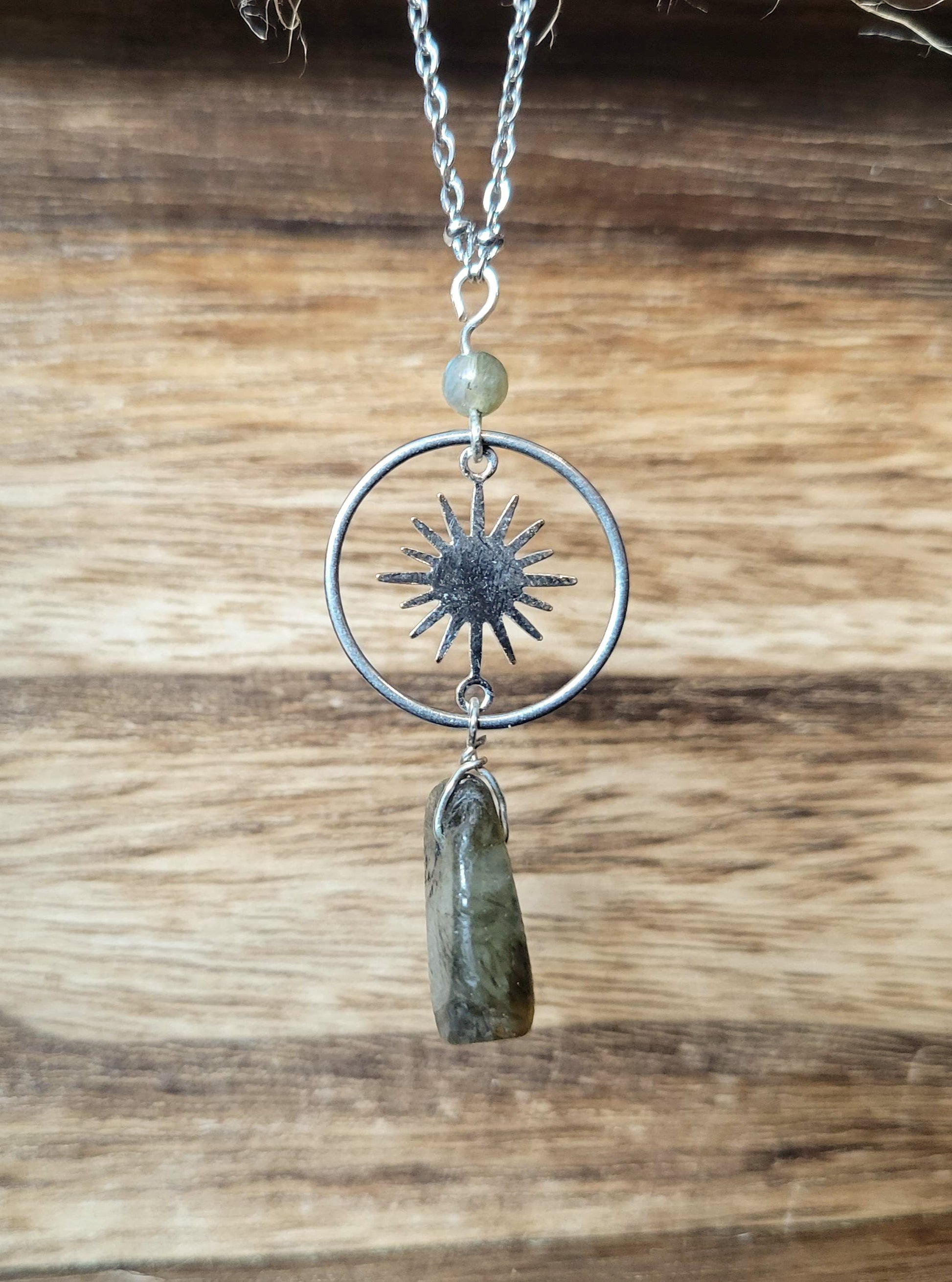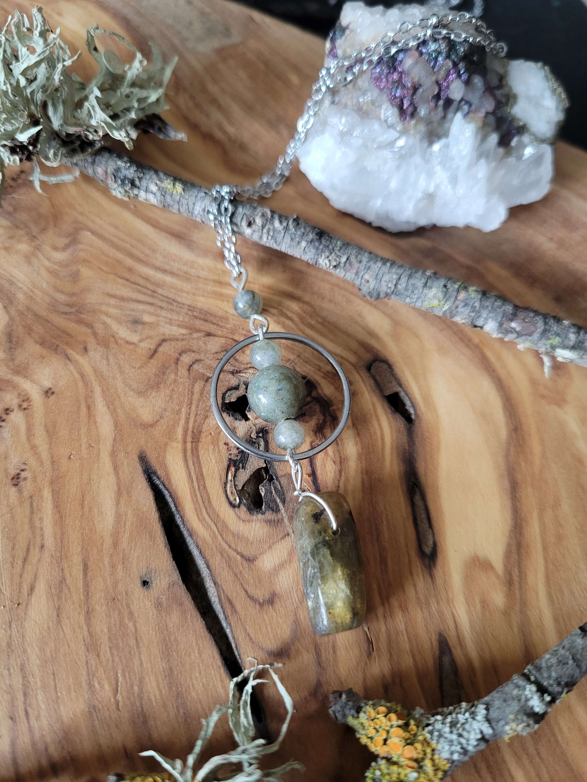 Elegant and understated, with a flashy hint of magic in the labradorite stones. 15 to 16 inch drop. Stainless steel.