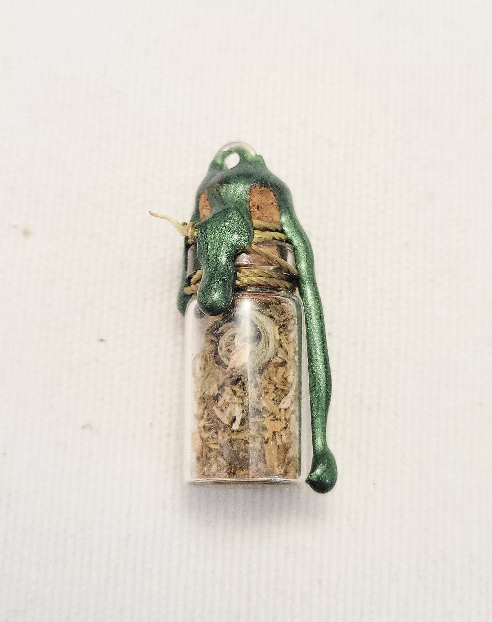 Shimmery green wax seals this small jar that is packed full of love. Contains chamomile, catnip, silvervine, allspice; rose quartz; green Venusian intention paper inscribed “I AM LOVED.”