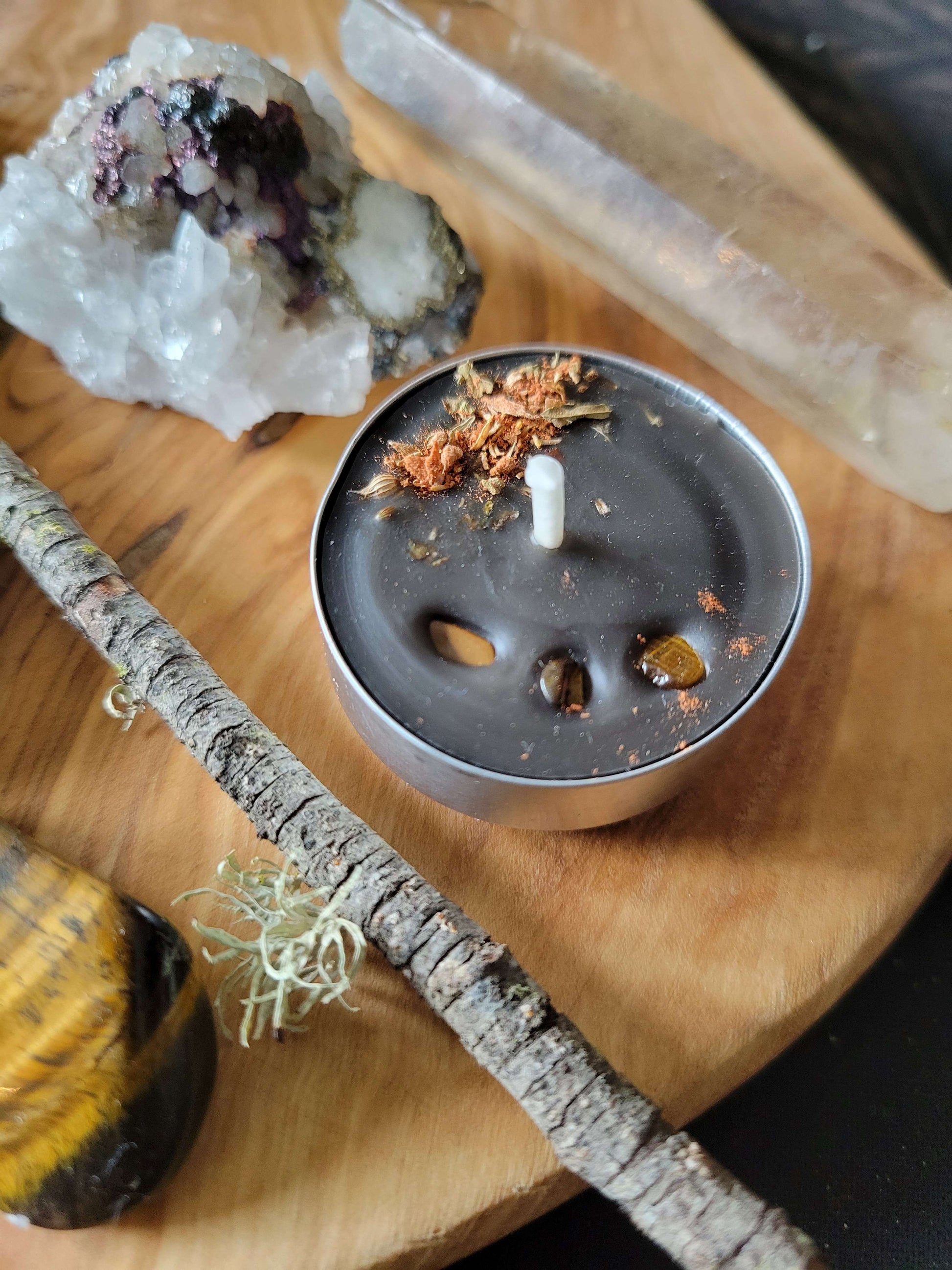 Give your spells a boost with our ritually crafted tea light candles. Each candle uses components picked to amplify your intentions. May contain herbs, oils, and crystals. Always exercise caution while using fire in your craft!